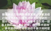 随着移动互联网的快速发展,手机游戏已经成为人们日常生活中不可或缺的一部分。有时候,玩家可能希望在同一设备上同时运行多个游戏,即“多开游戏”。多开游戏的好处包括但不限于同时管理多个账号、与朋友进行多游戏联动、或进行游戏之间的研究。那么,如何在手机上实现多开游戏呢?本文将详细介绍手机游戏多开的方法及注意事项。