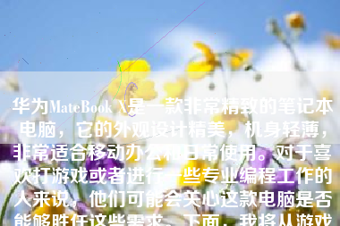 华为MateBook X是一款非常精致的笔记本电脑,它的外观设计精美,机身轻薄,非常适合移动办公和日常使用。对于喜欢打游戏或者进行一些专业编程工作的人来说,他们可能会关心这款电脑是否能够胜任这些需求。下面,我将从游戏性能、硬件配置、散热效果等方面来详细分析一下华为MateBook X打游戏的表现。