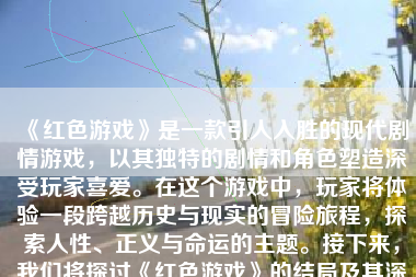 《红色游戏》是一款引人入胜的现代剧情游戏,以其独特的剧情和角色塑造深受玩家喜爱。在这个游戏中,玩家将体验一段跨越历史与现实的冒险旅程,探索人性、正义与命运的主题。接下来,我们将探讨《红色游戏》的结局及其深远影响。