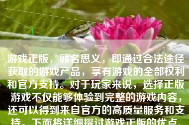总之,选择正版游戏不仅是对自己权益的保障,也是对原创作品和知识产权的尊重和支持。以上信息供参考,建议访问游戏公司官网或者数字平台以了解更多正版游戏的具体内容及相关活动等信息。