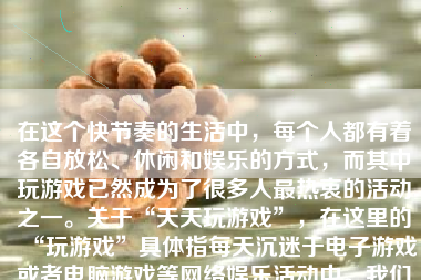 在这个快节奏的生活中,每个人都有着各自放松、休闲和娱乐的方式,而其中玩游戏已然成为了很多人最热衷的活动之一。关于“天天玩游戏”,在这里的“玩游戏”具体指每天沉迷于电子游戏或者电脑游戏等网络娱乐活动中。我们探讨这个问题时,并不是为了全面否定玩网络游戏的好处,而是要从科学、理性的角度分析这一行为可能带来的影响。