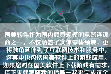国美软件作为国内颇具规模的电器连锁商之一,不仅涵盖了实体零售领域,更将触角延伸到了互联网技术和服务中,这其中也包括国美软件上的游戏应用。如果您对在国美软件上下载游戏有需求,接下来就跟随我的指导一起来完成这个步骤。