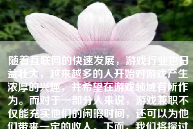 随着互联网的快速发展,游戏行业也日益壮大,越来越多的人开始对游戏产生浓厚的兴趣,并希望在游戏领域有所作为。而对于一部分人来说,游戏 *** 不仅能充实他们的闲暇时间,还可以为他们带来一定的收入。下面,我们将探讨如何进行游戏 *** 工作,主要针对写作者进行阐述。